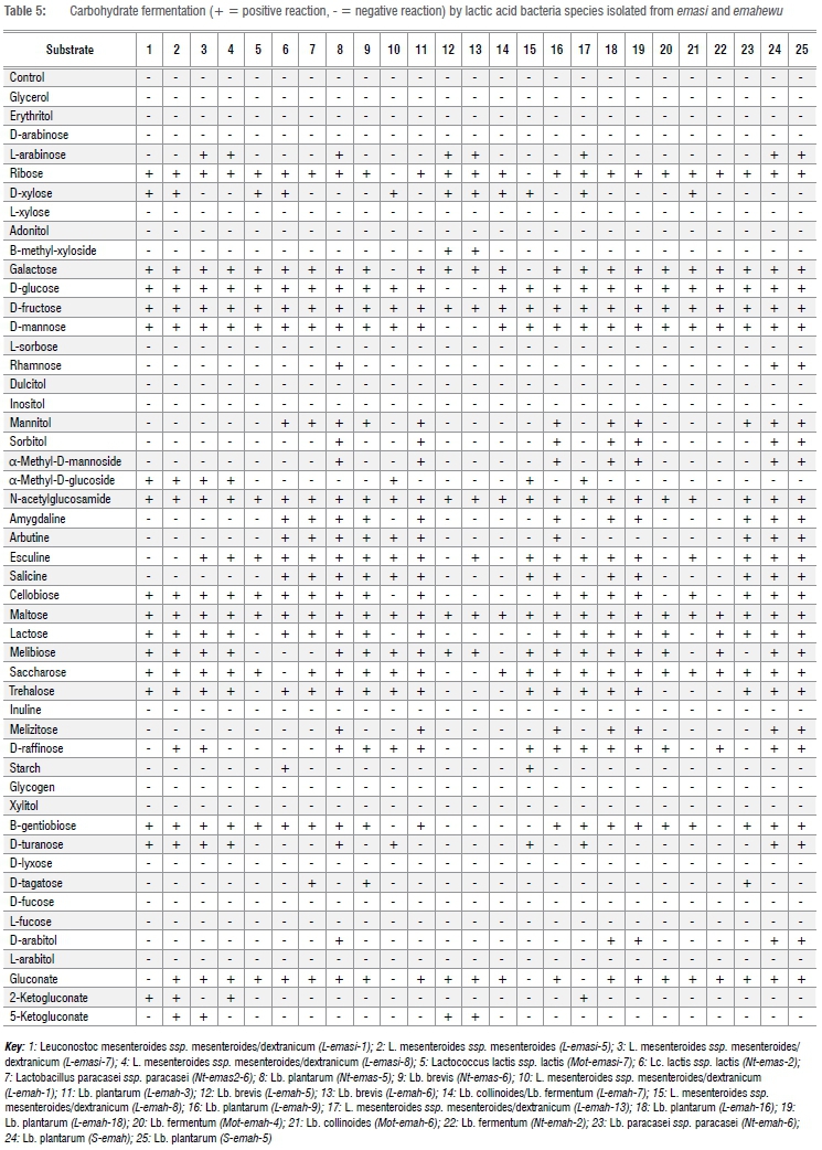 Of the 16 isolates from emahewu identified using the API 50 CH test kit, 6 were identified as Lb. plantarum, 3 as Leuconostoc mesenteroides ssp. mesenteroides, 2 as Lb. fermentum, 2 as Lb. brevis, and 1 as Lb. collinoides (Table 3).