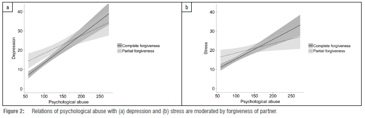 Results of the moderated regression analyses are reported in Table 3. Psychological abuse yielded positive relations with depression, anxiety and stress (all p<0.001). Forgiveness of partner was positively associated with depression (p<0.001) and stress (p =0.029), but not anxiety (p=0.063), such that the partial forgiveness group tended to report higher levels of depression and stress compared to those in the complete forgiveness group. Relations of psychological abuse with depression (p=0.043) and stress (p=0.039) were moderated by forgiveness of partner (see Figure 2), although no interaction effect was found for anxiety (p=0.164). Depression and stress were lower among participants in the complete forgiveness group at lower levels of psychological abuse, but were higher at more severe levels of psychological abuse.