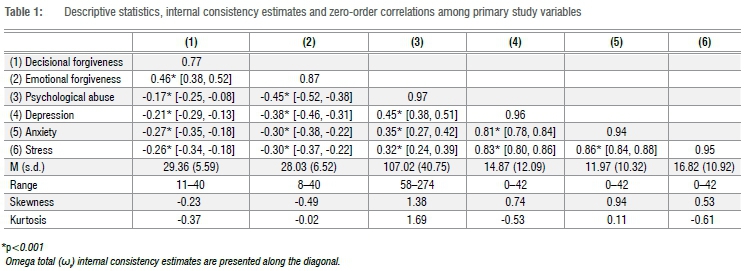 Descriptive statistics for the primary study variables and zero-order correlations among them are displayed in Table 1. Both decisional and emotional forgiveness evidenced negative relations with depression, anxiety, stress and psychological abuse, although effect sizes were generally larger for emotional forgiveness (r=-0.30 to -0.45, all p<0.001) than for decisional forgiveness (r=-0.17 to -0.27, all p<0.001). Psychological abuse associated positively with depression, anxiety and stress (r=0.32 to 0.45, all p<0.001).