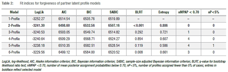 A latent profile analysis was used to test for the existence of forgiveness of partner subgroups based on unique combinations of decisional and emotional forgiveness. Models with one to six profiles were estimated to identify the model with the best fit. Along with the bootstrap (10 000 repetitions) likelihood ratio test, we report the log-likelihood value, the Akaike information criterion, and the Bayesian information criterion (BIC) and its sample-size adjusted variant. Information criteria were supplemented with values that estimate the precision of profile classification, including entropy and the mean posterior probabilities of profiles for each model. Statistically significant bootstrap likelihood ratio test p-values (p<0.05), lower BIC and sample-size adjusted BIC values, and models with entropy values closer to one and mean posterior probabilities ≥0.70 for all profiles were prioritised when making decisions about model fit.32-34 The unique subgroups that emerged from the latent profile analysis formed the 'forgiveness of partner' variable.
