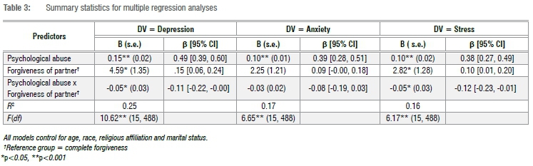 Separate multiple regression analyses were performed to examine whether 'forgiveness of partner' moderated relations between psychological abuse and indicators of psychological distress (i.e. depression, anxiety and stress). Main effects (i.e. psychological abuse and forgiveness of partner) and interaction effects (i.e. psychological abuse x forgiveness of partner) were specified for all models. The psychological abuse variable was mean centred before model estimation. Socio-demographic characteristics of age, relationship status, race and religious affiliation were included as covariates in each model. Visual inspection of quantile-quantile plots and residual plots produced via a Wallyplot technique35 indicated that the residuals for each model appeared approximately normal and homoscedastic in distribution. Collinearity diagnostics did not reveal any multicollinearity issues (all variance inflation factor values ≤3.41).