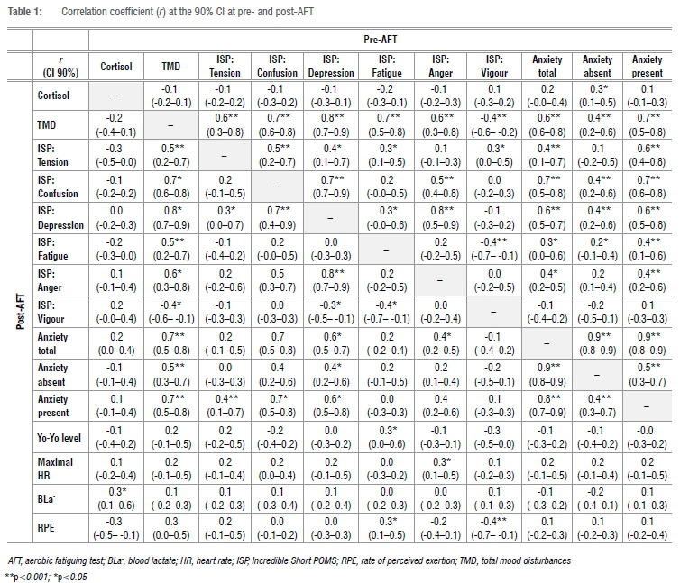 At pre-AFT, a slight positive relationship between cortisol and anxiety-absence (r=0.3, p=0.05) was seen. TMD demonstrated a strong relationship with all ISP and anxiety scores (r>0.4, p<0.01). Post-AFT results demonstrated a positive relationship between cortisol and BLa- (r=0.3, p=0.04), between ISP-anger and HRmax (r=0.3, p=0.03), ISP-anger and YYIR-level as well as ISP-fatigue (r=0.4, p=0.04), and between RPE and ISP-vigour (r=-0.4, p=0.008) as well as ISP-fatigue (r=0.3, p=0.05).