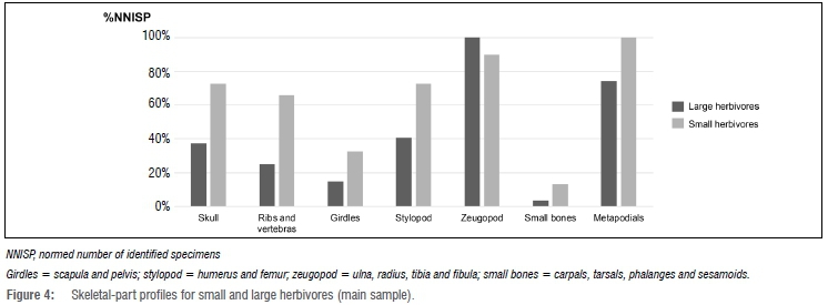 When body part data are analysed by size classes (Figure 4), skeletal-part profiles appear more balanced for small herbivores (i.e. relatively comparable proportions of skull, axial and long bones) than for large ones. Complete carcasses of small bovids might have been brought back to KDC more often, while bigger prey was introduced in the form of carcass segments.