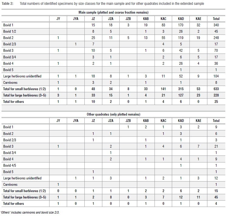 Of the 950 remains entered in the database (886 from the main sample), 101 could be identified beyond a size class attribution (Table 1). Carnivores are rare, with only five remains of Cape fur seal and four of unidentified small carnivores (potentially caracal and a smaller felid). Herbivores, notably bovids, dominate. Most are grazers that are often found in open grassland/savanna ecosystems. No strong diachronic patterning is evident in terms of species present throughout the sequence (Figure 2a). Even if some variations exist (e.g. hippopotamus, southern reedbuck and buffalo are only present in the lower part of the sequence - layers KAC to KAE - while elephant is present only in JZA), most might best be explained by sample size.