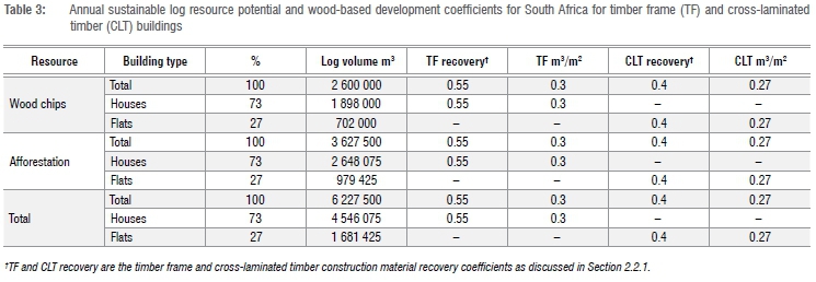 From the data in Table 1, it can be seen that - excluding imports and current pulp, board, and other log resources - there could be an estimated 6.23 million m3 of log resources available for wood house components in the future. This amount could be processed into between 2.9 and 4.9 million m3 of products depending on the product type and recovery rates. If timber frame construction requires on average 0.3 m3 of processed wood-based products per square metre (similar in volume to CLT according to Table 2), it means that between 9.6 and 16.3 million m2, or between 84 210 and 142 982 houses of 114 m2, can be built sustainably per annum. This is nearly double the amount of formal annual residential development at present. This clearly indicates the resource potential for an increased wood-based construction market in South Africa.