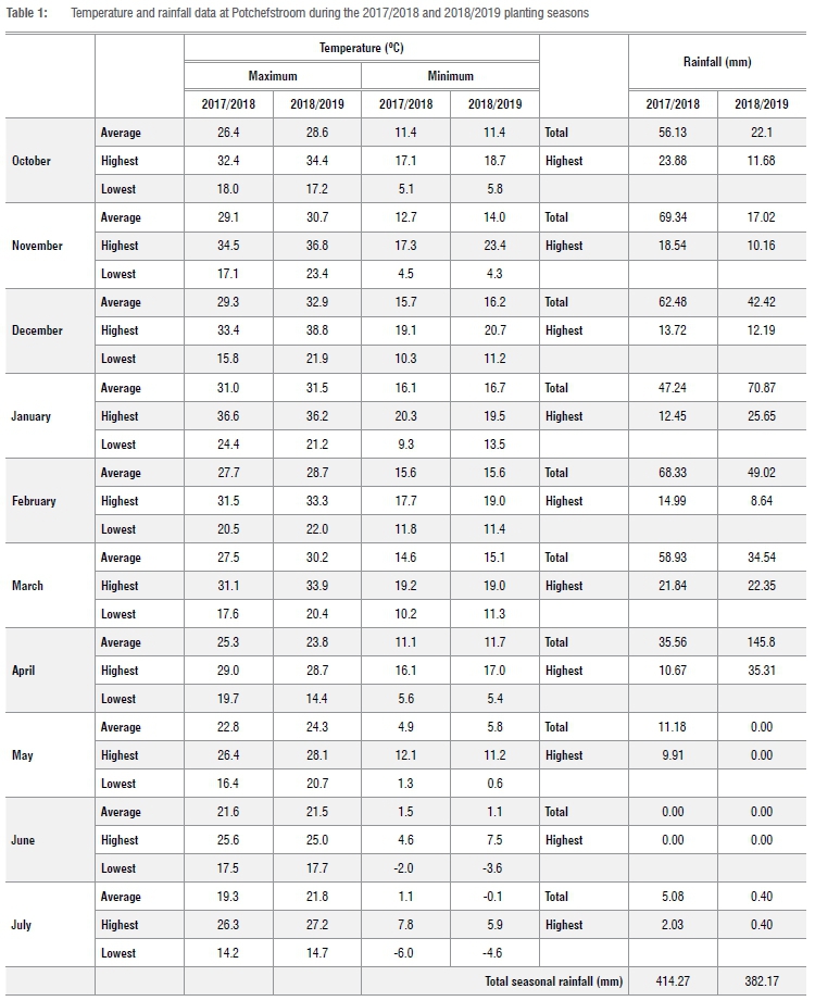 Weather data captured for the 2017/2018 and 2018/2019 planting seasons is presented in Table 1. The average temperatures achieved during October, November and December were 2.2 °C, 1.6 °C and 3.6 °C, respectively, higher during 2018/2019 than during 2017/2018. Total rainfalls recorded during the two seasons were similar. Higher early season rainfall (October to December 2017) was recorded for 2017/2018, compared to the corresponding period in 2018/2019. However, as all trials received supplementary irrigation, water was not a limiting factor. As all values were expressed as a percentage of the control, any value greater than the LSD of the relevant parameter assessed will also indicate that a specific treatment resulted in a significantly greater or lower measured effect than that of the untreated control. It was considered important to record such cases as an indication of whether the application of glyphosate would have a significant impact on the yield compared to that where no glyphosate was applied.