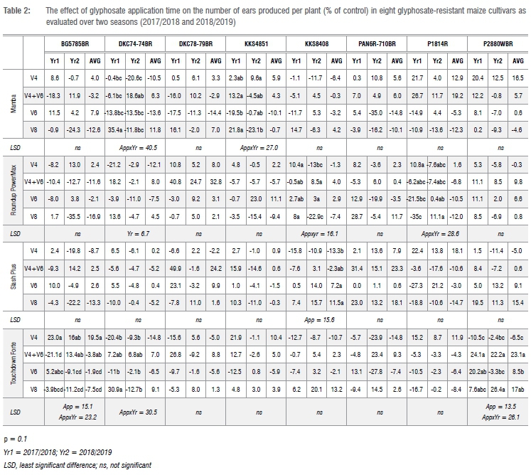 Seven cultivar x glyphosate product combinations were significantly affected by the application time x year interaction. DKC74-74BR was significantly affected by Mamba and Touchdown with a significant increase in EpP observed (Mamba - 35.4%; Touchdown - 30.9%) when applied at V8 in 2017/2018. During the following season, reductions of 11.8% (Mamba) and 12.7% (Touchdown), respectively, were observed for the same application time. A similar effect is observed for KKS4851 (PowerMax). When applied to P1814R, PowerMax reduced EpP during the first season (2017/2018) by 35%, with an 11.1% increase observed for the same application time in the following season. Touchdown applied at V4+V6 reduced EpP of BG5785BR by 21.1% in the first season, but increased EpP by 13.4% in the second season at the same application time. Touchdown similarly resulted in a 10.5% reduction in EpP when applied to P2880WBR at V4 in the first season.