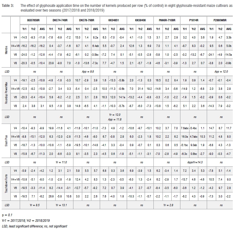 The main concern of local producers is, however, whether the application of glyphosate itself, in the absence of weed pressure, results in a yield loss due to some form of genetic predisposition. In a recent local study, Odendaal21 concluded that glyphosate application resulted in a reduction in plant height, dry mass and yield when applied at different growth stages of GR maize. The study, which evaluated two glyphosate products and five GR maize cultivars, also indicated that different GR maize cultivars showed significant variation in reaction to glyphosate applications, suggesting that some cultivars are more sensitive/tolerant to glyphosate than others. Seasonal variation was, similar to the current study, prominent within the field trials. In the current study, negative or positive values greater than the LSD represent instances in which a specific treatment resulted in a response which was either greater or poorer than that of the untreated control. In less than 6% of all cases where significance was observed in EpR, KpR, RpE, TKM or yield, a significant negative effect could be observed which was greater than that for the untreated control. For yield, only one cultivar x glyphosate product combination (KKS4851 x PowerMax) suffered yield losses which could be attributed to the application time of glyphosate. In this case, the effect was season dependent and was evident at the V4+V6 and V8 growth stages. Based on this observation, our findings from the current study concur with international research findings that the yield of GR maize cultivars is not significantly affected by the application of glyphosate or the application time thereof8,13, under growing conditions in which water is not a limiting factor.