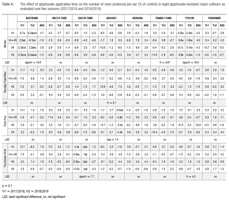 • Limited response in the yield parameters evaluated were obtained in response to the application time (V4, V4+V6, V6 and V8) of the four glyphosate products on eight GR maize cultivars tested (p=0.1).