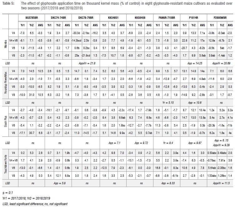 With application time as the main effect, significant differences were observed in 8 of the 32 cultivar x glyphosate product combinations (Table 5). PAN1814R generally yielded lower TKM with the application of Mamba, PowerMax and Slash at the later application times (V6 and/or V8). However, the reductions were not greater than that observed in the untreated control in any of these cases. A similar effect was observed in PAN6R-710BR, with the application of Touchdown at V8, reducing TKM by 6.1% (also not significantly different from the untreated control). KKS4851 was negatively affected with the application of Slash at V4, whilst the same product negatively affected TKM of KKS8408 at both V4 and V6 (not significantly different from the untreated control). Touchdown applied at V8 to DKC74-74BR resulted in a significant increase in TKM of 8.8% (Table 5). Of the eight cultivar x glyphosate product combinations which were significantly affected by application time, only the P2880BR x Slash combination resulted in significant differences in TKM which were greater than the untreated control (LSD(P=0.1)=6.2%), with an 11% reduction recorded at V6. As the application time x year interaction was also significant for this specific cultivar x glyphosate product combination (Table 5), the interpretation of this result should also take seasonal variation into account.