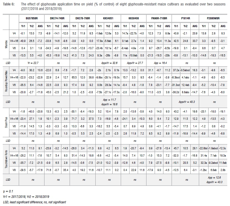 Effect of glyphosate application time on yield parameters of South African glyphosate-resistant maize cultivars