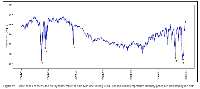 Cold water temperature anomalies occur throughout the temperature records on Nine-Mile Reef. Roberts et al.15 identified notable temperature anomalies during the year 2004. Figure 2 presents a time series of the measured temperatures at Nine-Mile Reef during the year 2004 as an example to highlight the temperature anomalies in the data.