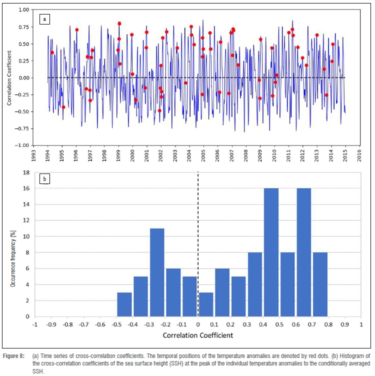 Instantaneous altimetry SSH fields over the 21-year period were cross-correlated to the conditionally averaged SSH field within a 2° region around Sodwana. Figure 8 presents a time series of the cross-correlation coefficients over the 21 years. Also presented in Figure 8 are the temporal positions of the temperature anomalies denoted by red dots. This was done to show the correlation of the SSH of each individual temperature anomaly to the conditional averaged SSH. Figure 8 also presents a histogram of the temperature anomalies correlation coefficient values.