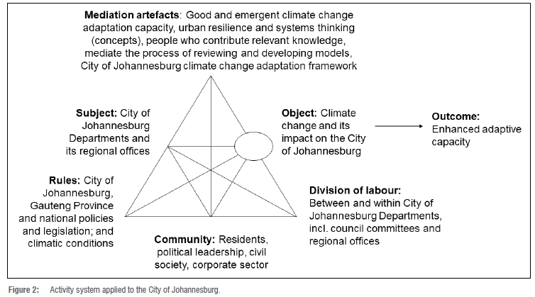 The object carries the motive force of the CoJ activity system, in this instance, climate change and its impacts. The City's departments, that should operate as a collective but often do not, are responsible for addressing the impacts of climate change on the City's stakeholders through division of labour and the use of human, conceptual and material tools, and are guided by rules (policies regulations, conventions and standards). These rules mediate the relationship between the City and its stakeholders, determining how the City addresses climate change. Yet different departments have different perspectives on climate change and its impact (i.e. 'multi-voicedness'). Given this, the creation of a shared object between the City departments, i.e. where there is a jointly constructed understanding, is needed to support innovation in the climate action planning and climate change adaptation problem-space (after Kerosuo et al.45).