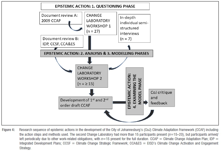 In Epistemic Actions 3 and 4 ('Modelling' and 'Examining the Model'), a CoJ Climate Change Adaptation Framework (CCAF) was co-developed in various smaller Change Laboratory sessions - with an average of between 2 and 6 participants. Different departments responsible for the identified issues were tasked with reframing challenges and identifying potential short-term, medium-term and long-term adaptation actions and solutions to resolve them (Epistemic Action 3: 'Modelling Solutions'). These were incorporated and developed into a first-order draft of the CoJ CCAF. The development of this draft specifically sought to enhance and resource the process, conceptual and design limitations of the original 2009 CCA Plan.