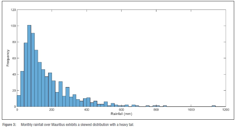 Extreme value theory is the study of extreme and rare events based on the Fisher-Tipett theorem, which can be regrouped into two categories: the block maxima and the peaks over threshold. The block maxima method consists of distributing the data set into equal non-overlapping periods and determining the maximum that occurs in each period, thus restricting the analysis to only maximum values. The peaks-over-threshold method defines a threshold value and deals with all values that exceed the threshold.19,20 As explained in the work of Ferreira and De Haan20, the block maxima method is more efficient than the peaks-over-threshold method as it produces the least associated mean square error and smallest difference between the extreme value index and the quantile estimator. Seebocus et al.11 showed that the frequency distribution of rainfall data for Mauritius (see Figure 3) can be represented using the GEV distribution. In this study, the block maxima method is used with the GEV distribution, where the cumulative distribution function is formulated as21:
