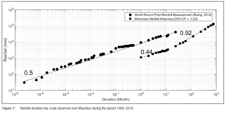 The scaling phenomena for the rainfall data is displayed in Figure 7. Superimposed over Figure 7 is the plot of the world record rainfall measurements of Zhang39. The best-fit lines indicate the relationship between maximum rainfall and duration. For the case of Mauritius, within a range of 1 month to 1 year, the maximum precipitation duration law exponent is 0.44 as compared to 0.9 (which indicates a random process with persistence) or the long-time range duration (>1 year).