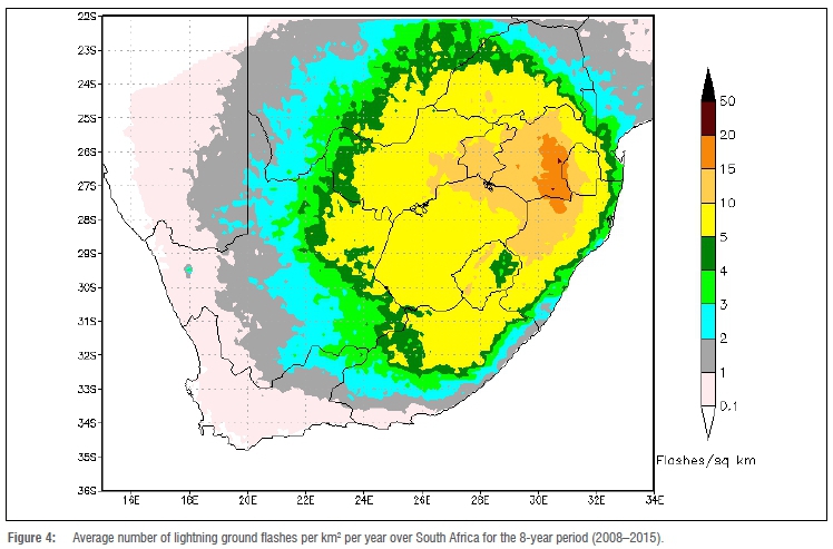 Figure 4 indicates the annual ground flash density for the entire country, showing how the lightning flash density is distributed over South Africa. The results show that high flash densities occur over Mpumalanga, KwaZulu-Natal and Gauteng Provinces, with the highest flash density over the far northern parts of KwaZulu-Natal and the Mpumalanga escarpment. The flash density declines towards the west of the country, along the coast and towards the northeastern parts of the country. Over the mountainous region of Lesotho, flash densities of <5 flashes/km2 were observed. Gijben37 and Gill39 presented similar results.