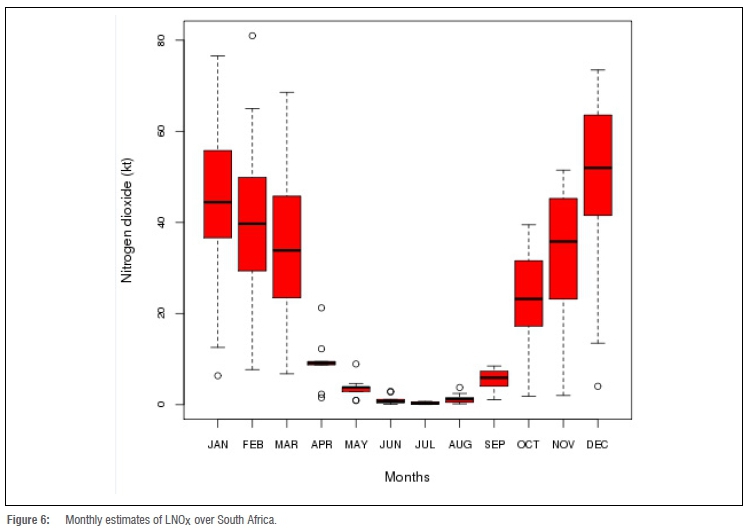 Production of NOx by lightning differs seasonally, in accord with lightning distribution. High production of LNOx occurs in summer (NDJ) and autumn (FMA). This high LNOx production is associated with deep convective thunderstorms, which are accompanied by lightning. During spring, a moderate amount of lightning occurs, while in winter there is close to zero lightning occurrence as there is lack of moisture and the atmosphere is stable, hence production is at a minimum during winter (MJJ).