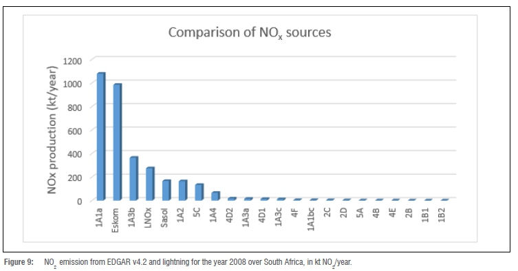 The EDGAR v4.2 data used in the study provide estimates of the global biomass burning and anthropogenic emissions. The existing data are for all countries, with emissions given per main source category, on a spatial resolution of 0.1° x 0.1° grid over the globe. The database was obtained from the European Commission's Joint Research Centre data catalogue for the entire South Africa.61 According to EDGAR v4.2 data (Table 4), the largest anthropogenic source of nOx is the power generation sector (1A1a) which accounts for 1078.7 kt of NO2 per year.