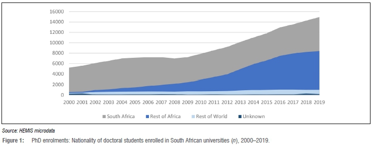 Our approach is quantitative and relies on trend data to establish whether South Africa is maintaining its position as a doctoral hub for students from the rest of Africa. Data are critical because many unsubstantiated or partially unsubstantiated claims are made about the state of doctoral education in relation to the number and experiences of African doctoral students in the South African higher education system.850 Our approach provides an update on previously published data on doctoral education in South Africa.8,13,14,19,36