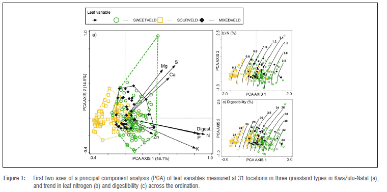 There was a strong forage quality gradient along which sourveld sites were most distinct for their low leaf digestibility, N%, and cation concentrations (Figure 1). Digestibility doubled and N% ranged five-fold across this gradient (Figure 1b,c).