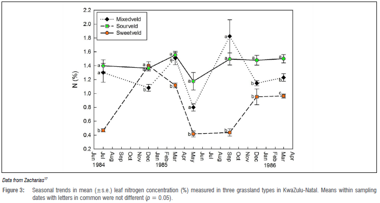17. Zacharias PJ. The seasonal patterns in plant quality in various ecological zones in Natal [MSc thesis]. Pietermaritzburg: University of Natal; 1990. https://researchspace.ukzn.ac.za/handle/10413/20233 [ Links ]