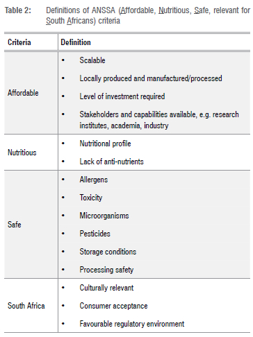 A quantitative study was conducted to gain insight from South African food science and technology professionals on the potential of these UEFSTs to provide affordable, nutritious, safe food products. The question was defined so that respondents could familiarise themselves with the six underutilised or emerging food sources. The survey (Table 1) was designed around criteria related to affordability, nutrition, safety, consumer acceptance and regulatory environment (referred to as ANSSA criteria - Affordable, Nutritious, Safe, relevant for South Africans). The ANSSA criteria (Table 2) were designed to evaluate those UEFSTs most likely to be produced locally at scale, to be accepted by South Africans, and to enable a sustainable and affordable diet while improving the population's health. A question was also included to understand the time horizon for commercialisation in South Africa. The survey consisted of 14 questions. The criteria were rated on a 4-point Likert scale, where 4 = strongly agree, 3 = agree, 2 = disagree and 1 = strongly disagree.