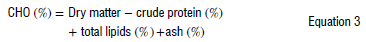 Moisture, ash, and protein contents were analysed following the official methods of analysis of AOAC International.29 Crude protein was determined using the Leco method (TruSpecTMLeco). Crude fat was determined using the chloroform : methanol (2:1) solvent extraction method, containing 0.01% butylated hydroxytoluene as an antioxidant.30 The percentage carbohydrates (CHO) was calculated by the difference using Equations 3 and 4.