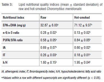 The PUFA/SFA ratio has been described as a useful indicator for evaluating the nutritional quality of food lipids.5 The recommended PUFA/SFA ratio for food is >0.45, and any foods with a ratio below this may be considered detrimental to human diets as it may result in elevated blood cholesterol levels.5 According to published data5,53, the PUFA/SFA ratio for bivalve shellfish is usually above 0.45. Hot smoking significantly increased the PUFA/SFA ratio (0.84 ± 0.05) above the recommended ratio of 0.45 because of the overall decrease in the SFA and increase in PUFA.