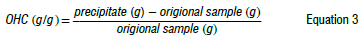 The methods described by Ayadi et al.22 and Du Toit2 were slightly modified to determine the OhC. Freeze-dried mucilage, SPI powder and egg albumin powder (0.1 g) were each added to 2 mL sunflower oil (Pick n Pay Group) and shaken for 5 min using a Vortex Genie. The solution was centrifuged using a 5417C centrifuge (Eppendorf, Germany) for 30 min at 2090xg. The supernatant oil was separated carefully using a pipette and weighed, and the centrifuge tube was inverted for 12 h. The precipitate was weighed, and the amount of oil held by the powder was calculated using Equation 3: