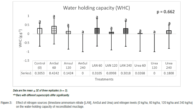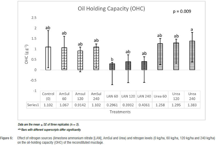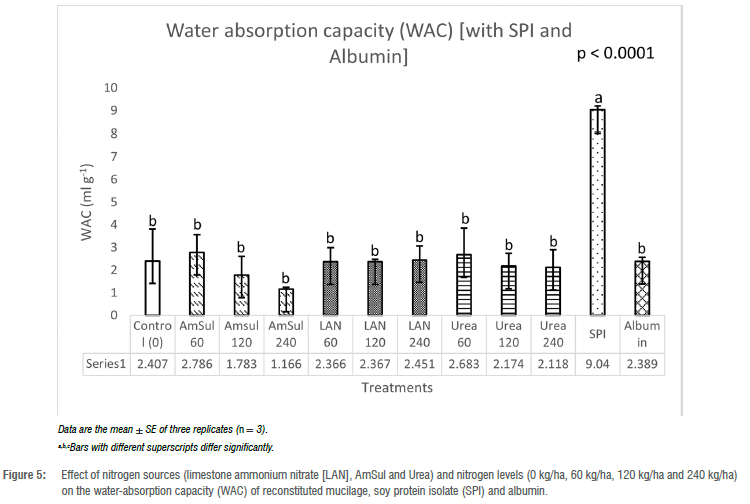 The WHC of the freeze-dried mucilage (all samples from N-fertilised plants) and albumin (Figure 3) differed significantly (p < 0.0001) from SPI as it recorded a WHC value (5.420 g/g) that is significantly higher than that of all the other samples. The hypothesis states that a higher protein content will result in a higher functionality of the sample.7 Therefore, it was expected that SPI and albumin would perform much better than freeze-dried mucilage in terms of WHC. This hypothesis was true for SPI but not true for albumin. The low WHC of albumin may be because of its high solubility in water.12 Albumin recorded a WHC of 0 g/g, as already explained with AmSul 240 and Urea 120, and when the supernatant of the albumin sample was decanted after centrifugation, a portion of the albumin powder was dissolved in the supernatant, and this portion of albumin powder was decanted along with the supernatant. Therefore, the wet precipitate left in the reaction tube had less albumin powder than what had initially reacted with the water.