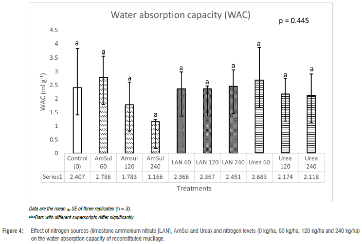 N fertilisation did not have a significant effect on the WAC of O. ficus-indica freeze-dried mucilage (Figure 4). As with the WHC, SPI recorded a WAC value that was significantly higher than those of the albumin and mucilage samples (Figure 5). There appear to be no research outputs on the effects of N fertilisation or any other form of fertilisation on the WAC of O. ficus-indica freeze-dried mucilage. According to Du Toit2, cultivar did not have a significant effect on the WAC of freeze-dried mucilage. The month of harvest had a significant effect on the WAC of freeze-dried mucilage, with August being the month when WAC was best.2 A WAC average of 8.04 g/g was recorded for four cultivars, and 'Morado' had the highest WAC value.2 The values obtained by Du Toit2 do not compare well with the values found in the current study, probably because the harvesting dates differ significantly. A WAC range of 2.454.60 mL/g was reported for okra mucilage.24 The mean WAC recorded for the Opuntia mucilage samples (2.23 mL/g) in the current study is lower than the mean WAC recorded for okra mucilage (3.51 mL/g).34