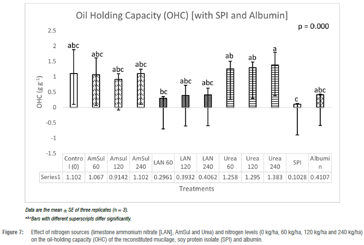 The OHC of the freeze-dried mucilage (all samples from N-fertilised plants), SPI and albumin (Figure 7) differed significantly (p < 0.000). SPI (0.1028 g/g) recorded an OHC that was significantly lower than that of the Urea 240 (1.383 g/g) freeze-dried mucilage sample. SPI also recorded the lowest OHC value compared to all the other mucilage samples. Albumin (0.4107 g/g) recorded a low OHC value compared to the control, AmSul and Urea treatments. The hypothesis states that a higher protein content will result in more functionality of the sample.7 Therefore, it was expected that SPI and albumin would perform much better than freeze-dried mucilage in terms of OHC, but this hypothesis was not true for OHC. Of the freeze-dried mucilage samples, lAn 120 was expected to perform the best for OHC, but the hypothesis was again not true for OHC for the LAN 120 samples. Urea 60 and the control were expected to perform the worst, although this was not observed for OHC of Urea 60 and the control. In essence, a high-protein content seems to not have had a positive effect on the OHC of SPI, albumin and freeze-dried mucilage.7