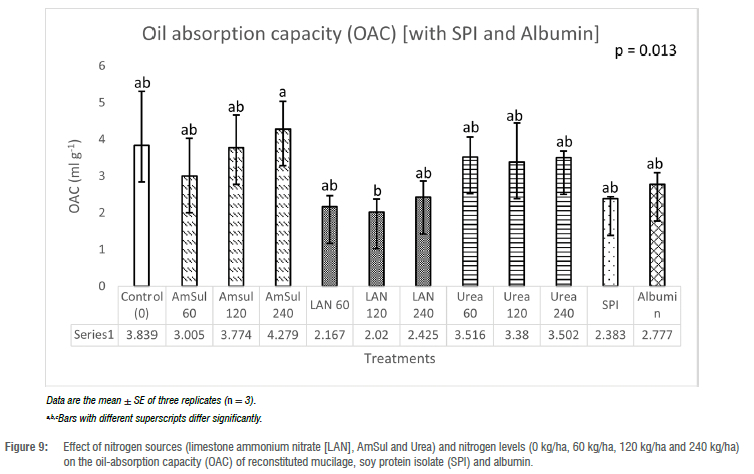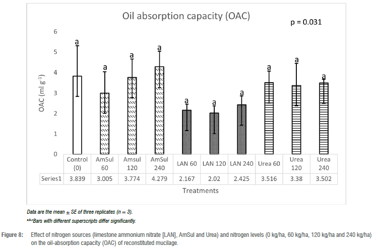 The OAC is commonly attributed to the physical entrapment of oil by the protein.26 Oil-absorption properties are vital because they are associated with a positive mouth feel and an improved flavour perception of the food product into which they are incorporated.25 N fertilisation significantly affected the OAC of freeze-dried mucilage (Figure 8). Whilst a statistically significant overall effect of N fertilisation on OAC was observed, the lack of significant pairwise differences between treatments limits the strength of this conclusion. The observed variation may suggest a trend, but further studies with larger sample sizes or more sensitive designs are needed to confirm specific treatment effects. SPI and albumin recorded lower OAC values than most of the mucilage samples (Figure 9). The hypothesis states that a higher protein content will result in more/ higher functionality of the sample. Therefore, it was expected that SPI and albumin would perform much better than the freeze-dried mucilage samples in terms of OAC, but this hypothesis was not true. Of the freeze-dried mucilage samples, LAN 120 was expected to perform the best for OAC because of its protein value, but the hypothesis was not true. Urea 60 and the control samples were expected to perform the worst, and again this was not true for OAC. In essence, a high-protein content seems to not have had a positive effect on the OAC of SPI, albumin and freeze-dried mucilage samples. SPI and albumin may have recorded lower OAC values than the freeze-dried mucilage samples because they are more soluble in oil.