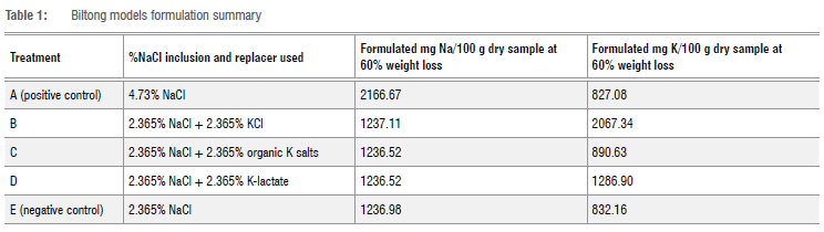 According to an unpublished survey by this research team, the average %NaCl in biltong samples from various supermarkets and butcher shops is 4.73%. This value was used as the positive control, or Treatment A, and as the basis of the formulation of all the biltong treatments used in this study. The remaining treatments were formulated to contain 50% of the NaCl of Treatment A. The formulations were based on a 60% weight loss, as recommended by the South African Council for Scientific and Industrial Research.6 Table 1 summarises the targeted %NaCl, replacer and mg Na/100 g in the dry sample for each treatment at a 60% weight loss.