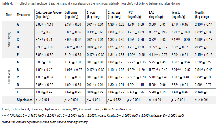 Although not significant, Treatment B, containing 4.75% NaCl (Table 3), was not as effective against the inhibition of coliforms as Treatment A, which contained 5.76 % NaCl.18 The detection of coliforms is used as a general indicator of sanitary conditions in the food-processing environment.19 According to Jones and co-workers12, commercial biltong may have Enterobacteriaceae and coliform counts of up to 4 log cfu/g, indicating that biltong manufactured from all treatments in this study was produced very hygienically with Enterobacteriaceae and coliform counts of the dry biltong generally below log 2 cfu/g.