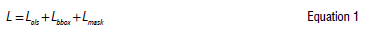 During the training of Mask R-CNN, a multitask loss is defined for each region of interest. The multitask loss (Equation 1) is the combination of the losses associated with the tasks of classification (Lcls), localisation (Lbbox) and instance segmentation (Lmask)1,25: