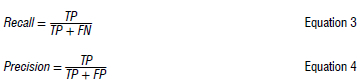 where 0 < IoU < 1. The IoU is essentially a measure of the overlap of the predicted bounding box and the groundtruth bounding box.1 A perfect detection would have an IoU of one, while a predicted bounding box that does not overlap at all with the groundtruth bounding box will have an IoU of zero.1 The IoU is used to determine whether a detection is a true positive or false positive.51 A predicted bounding box is considered to be a true positive if the IoU is greater than some user-defined threshold, usually at least 0.5.1,50 For a given IoU threshold, the true positive (TP) and false positive (FP) predictions can be used to determine the recall (Equation 3) and precision (Equation 4)1: