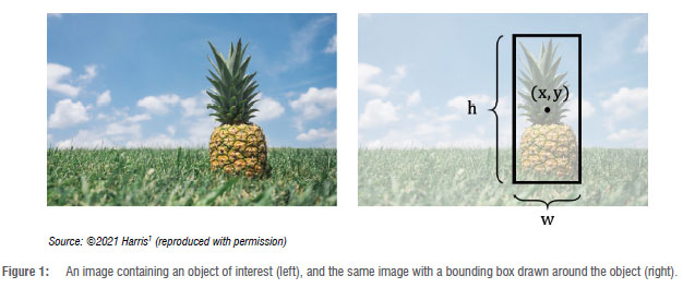 The first task involved pineapple detection from images - an object detection problem. The goal of object detection is to locate all object instances in an image from a list of predefined classes.1,7 Hence, the problem involved both predicting the category and drawing a bounding box around each object in an image.1 A bounding box is the minimum-sized rectangular border that fully encloses an object and indicates its location within an image.1 Figure 1 illustrates the bounding box coordinates (x,y,w,h) of the object of interest in an image, including the (x, y) coordinates of the centre of the box, as well as the height (h) and width (w) of the box.1 By convention, the top left corner of the image has (x, y) coordinates of (0, 0).1
