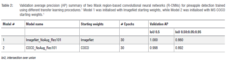 Several instance segmentation models were considered in this work. The pineapple detection performance was assessed with respect to transfer learning using pretrained COCO and ImageNet weights, the choice of CNN backbone and data augmentation techniques.1