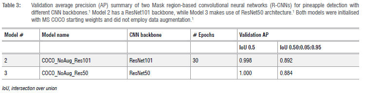 The aim of the first task in this study was to train an instance segmentation model to effectively localise pineapples within images.1 To this end, several Mask R-CNN models, as described in Table 1, were considered and were assessed using several evaluation metrics such as multitask loss, intersection over union (IoU) and AP.
