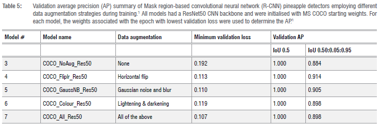 The first three models in Table 1 have no augmentation applied to the data sets. The main decision is based on starting weights and CNN backbone. The training and validation losses associated with Model 2, initialised with COCO pretrained weights, are considerably lower than those of Model 1, which was initialised with ImageNet weights.1 This may be due, in part, to the fact that the ImageNet data set has an average of only 1.5 objects per image, while the COCO data set has an average of 7.3 objects per image, which is more comparable to the average number of objects per image in the pineapple data set (an average of 13.4 pineapples per image).1