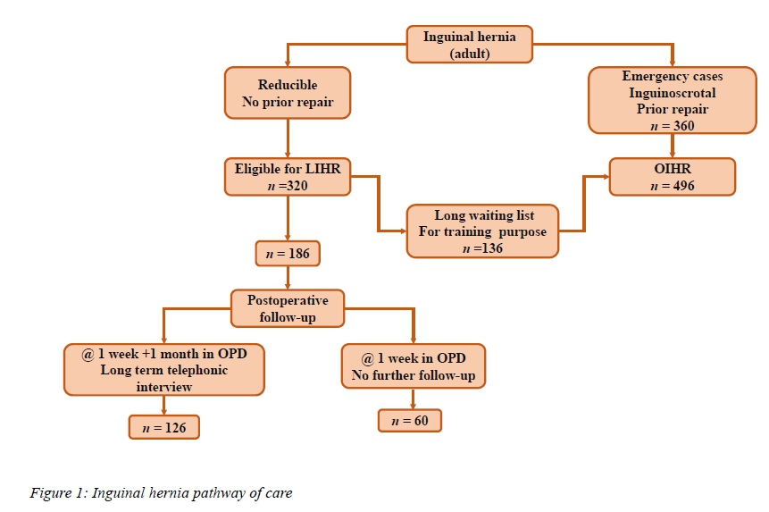 In the unit, all patients who present with a primary, elective, reducible inguinal hernia are allocated to the LIHR list. Emergency, irreducible and large inguinoscrotal hernias had open inguinal hernia repair. For training purposes and to keep the surgical backlog to a minimum, some of the potential LIHR cases were also allocated to the OIHR list (Figure 1).