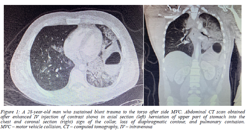 Traumatic diaphragmatic hernia (TDH) is defined as the protrusion of the abdominal structures through an injured diaphragm into the thoracic cavity. The relative incidence of blunt and penetrating diaphragmatic injury (DI) reflects differences in geographic regions and socioeconomic characteristics of these regions. Blunt trauma (BT) is often common in developed regions; however, less developed regions have higher rates of penetrating injuries.1