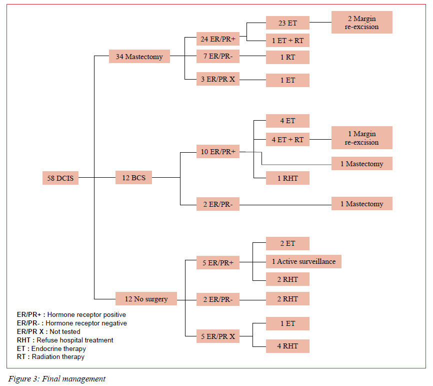 RESULTS: Out of 1 813 patients diagnosed and managed with breast malignancies in this period, 58 (3.1%) patients were identified with isolated DCIS. Forty-three (74.1%) of these patients were symptomatic. Thirty-four (58.6%) patients had a primary mastectomy, and 12 (20.6%) had breast-conserving surgery.