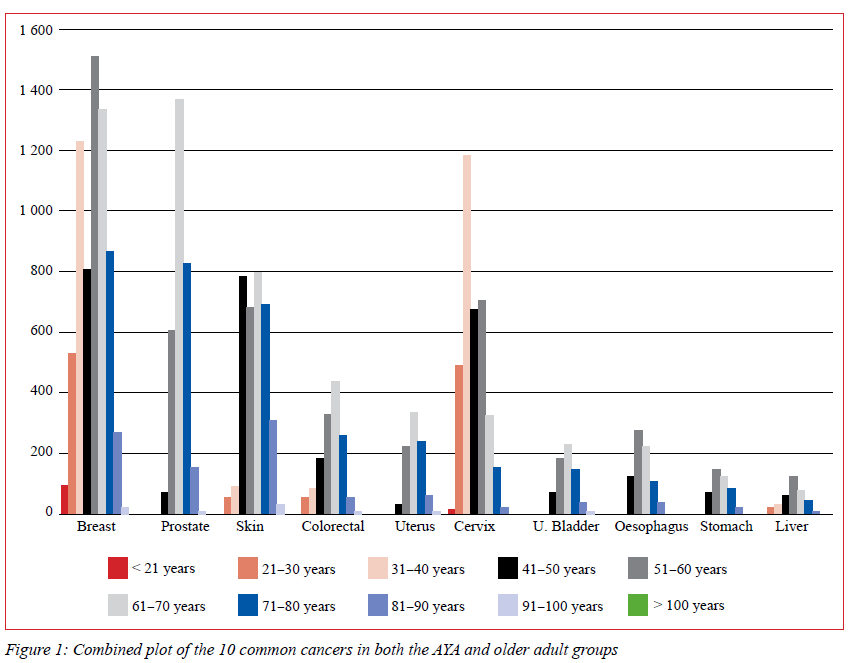 CONCLUSION: Eleven per cent of invasive malignancies were diagnosed in AYA and 81% involved females. Cancers of the breast, cervix, skin, and colon were the top four most common tumours in AYA. The burden of breast and colorectal cancer was higher in AYA than in older adults. Prostate cancer is rare in AYA and lung cancer was not among the top 10 malignant tumours in our setting. Over 11% of primary malignant tumours of the anus, breast, cervix, colon, conjunctiva, liver and rectum were diagnosed in AYA.