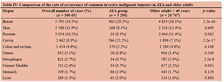 Data retrieved included the treating hospital, year of diagnosis, gender, age, HIV status, the organ involved and the histological diagnosis. The age cut-off of 16-40 years was used for the AYA group. Patients who were more than 40 years old were classified as older adults. Data were entered into an Excel spreadsheet and analysed using the ModelRisk software. Categorical data was expressed in numbers and percentages. The rate of occurrence of the common malignant solid tumours, including the ones which would primarily be managed by general surgeons in the AYA group, was compared to findings in the older adults. A chi-square test was used to compare categorical data and a _p-value below 0.05 was considered statistically significant.