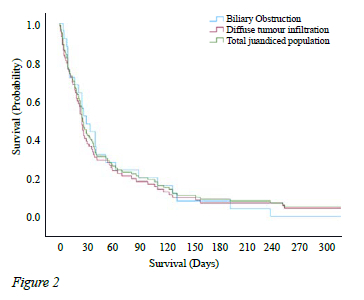 Survival was compared for patients with diffuse tumour infiltration and those with OJ. In the latter, a sub-group analysis was performed for those undergoing BD compared to patients treated with BSC only.