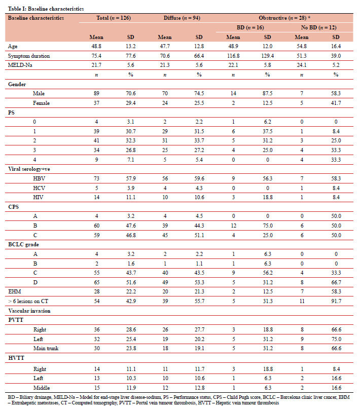 We identified two distinct groups of HCC patients who present with jaundice. In the first and larger group, jaundice is caused by diffuse hepatic tumour infiltration and/or ESLD. Given the poor PS, the multifocality of disease, the high burden of extrahepatic disease and frequent vascular invasion, these patients were managed with BSC only. Although radioembolisation, sorafenib and novel biological targeted therapies are potential treatment options, these are not available at state health care facilities in South Africa.3-5